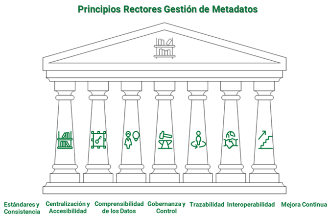 La gestión de metadatos se rige por el siguiente conjunto de principios rectores, que actúan como directrices para todas las actividades relacionadas con su definición, documentación, mantenimiento y uso::
