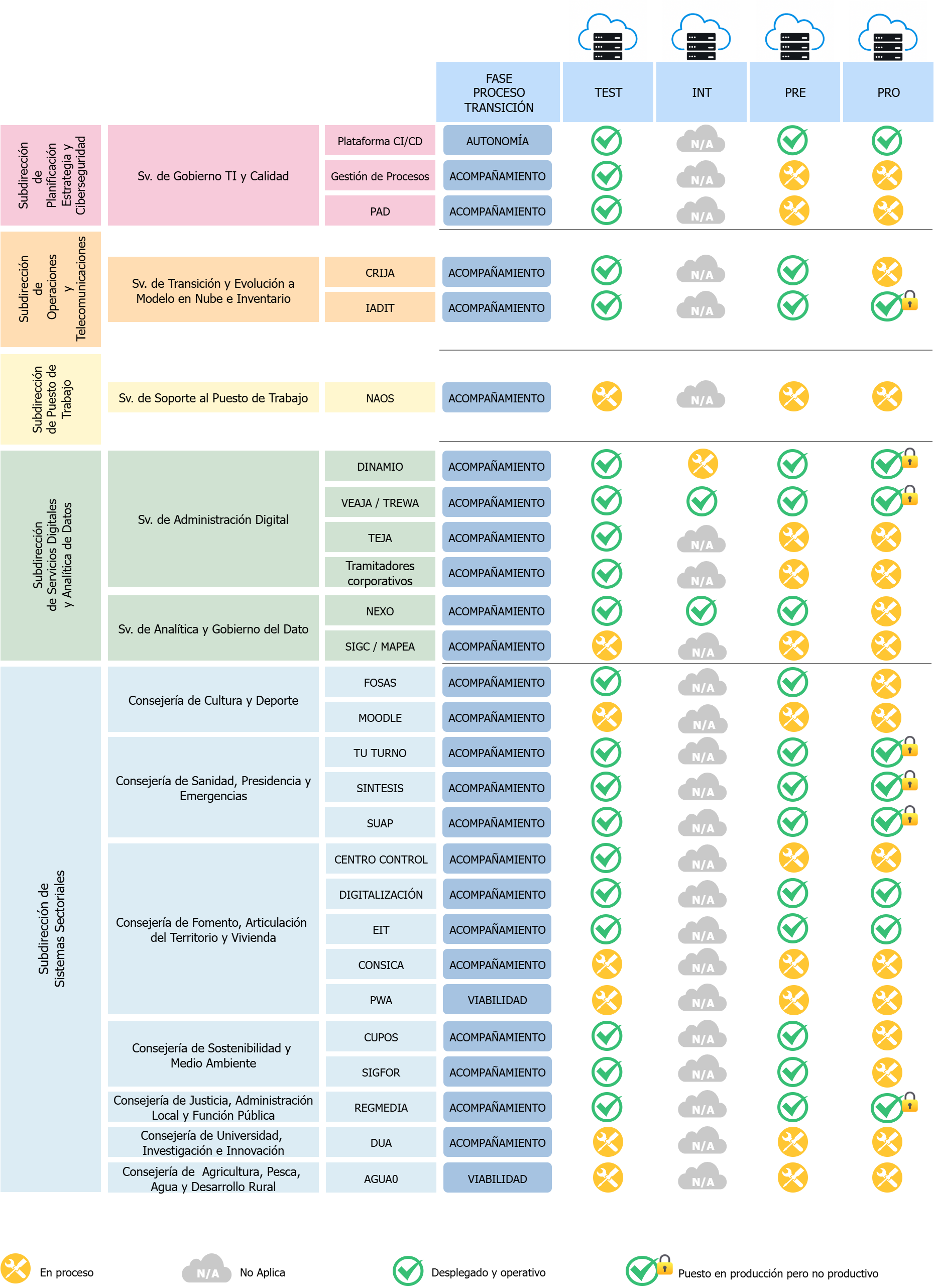 En la siguiente imagen se muestra el estado de los Sistemas de Información incorporados actualmente en el Proceso de Transición a DevSecOps indicando el entorno de ejecución en el que han desplegado y en los que se está trabajando para desplegar.