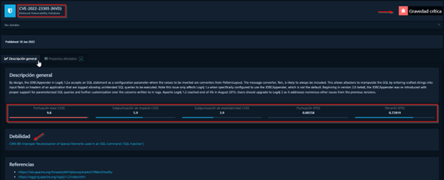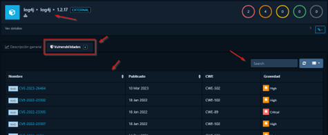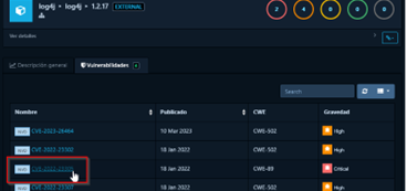 Cada vulnerabilidad incluye detalles como el CVSS score, la descripción y las recomendaciones de mitigación. Para acceder a este submenú, es necesario entrar en el componente afectado y seleccionar una vulnerabilidad de la lista.