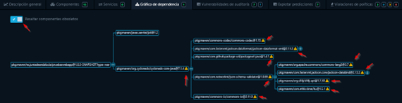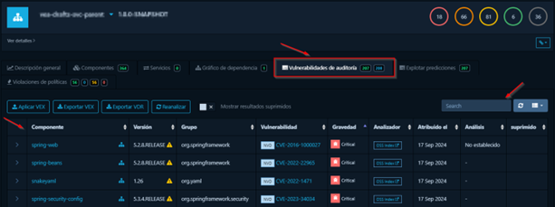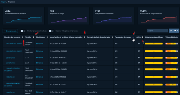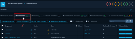 El usuario podrá visualizar un listado de todas las dependencias utilizadas en el proyecto, además de conocer otros detalles como la versión, el grupo, la licencia y los puntos de riesgo. Este último campo se calcula en base a diversos factores y se utiliza para priorizar las vulnerabilidades y guiar las acciones de remediación.