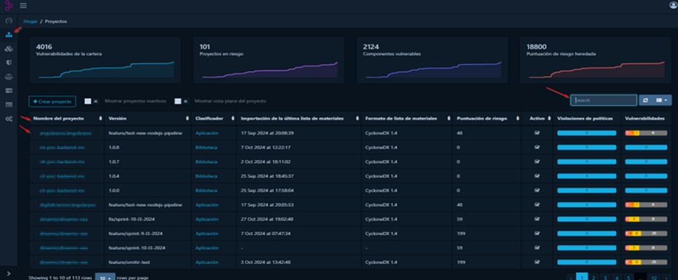Al igual que en el filtrado de proyectos, en este panel el usuario podrá organizar y analizar de manera eficiente la información sobre las dependencias de su proyecto. Se puede organizar alfanuméricamente por nombre, versión y puntuación de Riesgo.