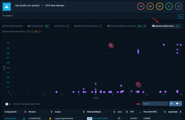 A continuación, se puede ver un ejemplo de un proyecto que contiene varias vulnerabilidades y un gráfico de probabilidades de explotación.