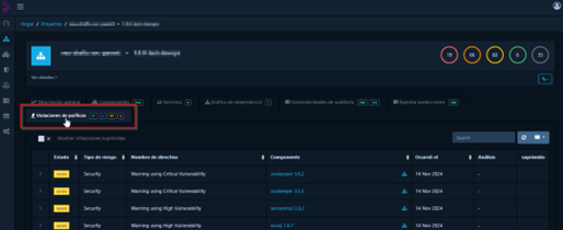 El usuario podrá ver el listado de todas las políticas infringidas con la implementación de los componentes detectados. Cada política incluye detalles sobre la regla específica y realizar las acciones recomendadas para cumplir con las políticas.