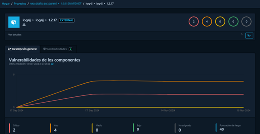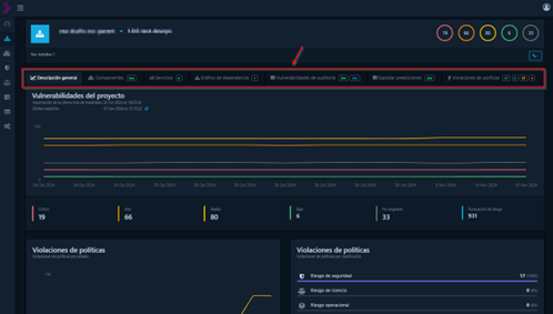Explorar un proyecto en detalle permite al usuario acceder a información más específica para entender mejor las dependencias y vulnerabilidades de cada proyecto. Esto es esencial para el proceso de gestión y mitigación de riesgos asociados al componente. En la siguiente captura se puede observar la vista general dentro del proyecto.