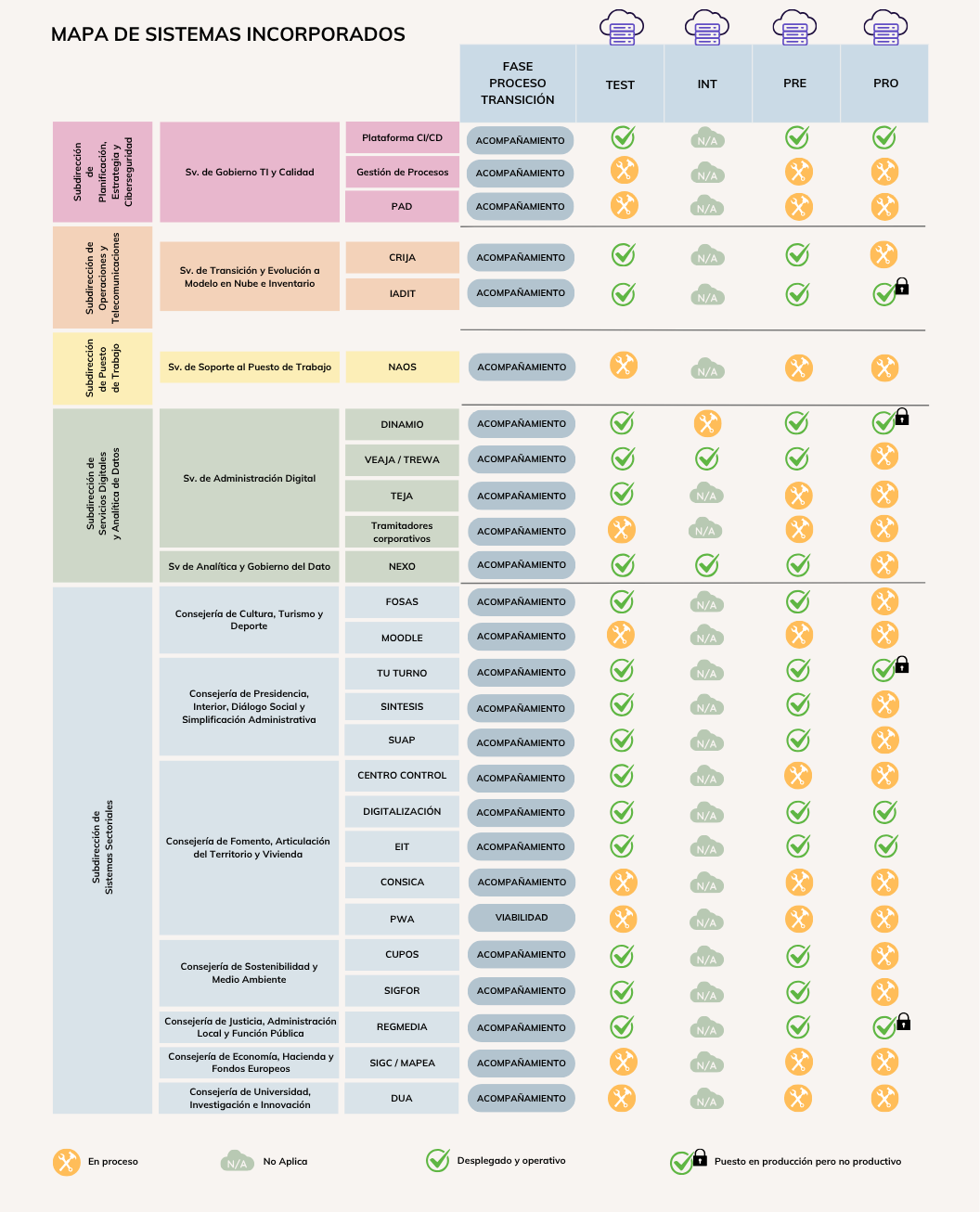 En la siguiente imagen se muestra el mapa de Sistemas de Información incorporados actualmente en el Proceso de Transición a DevSecOps indicando el entorno de ejecución en el que han desplegado y en los que se está trabajando para desplegar.